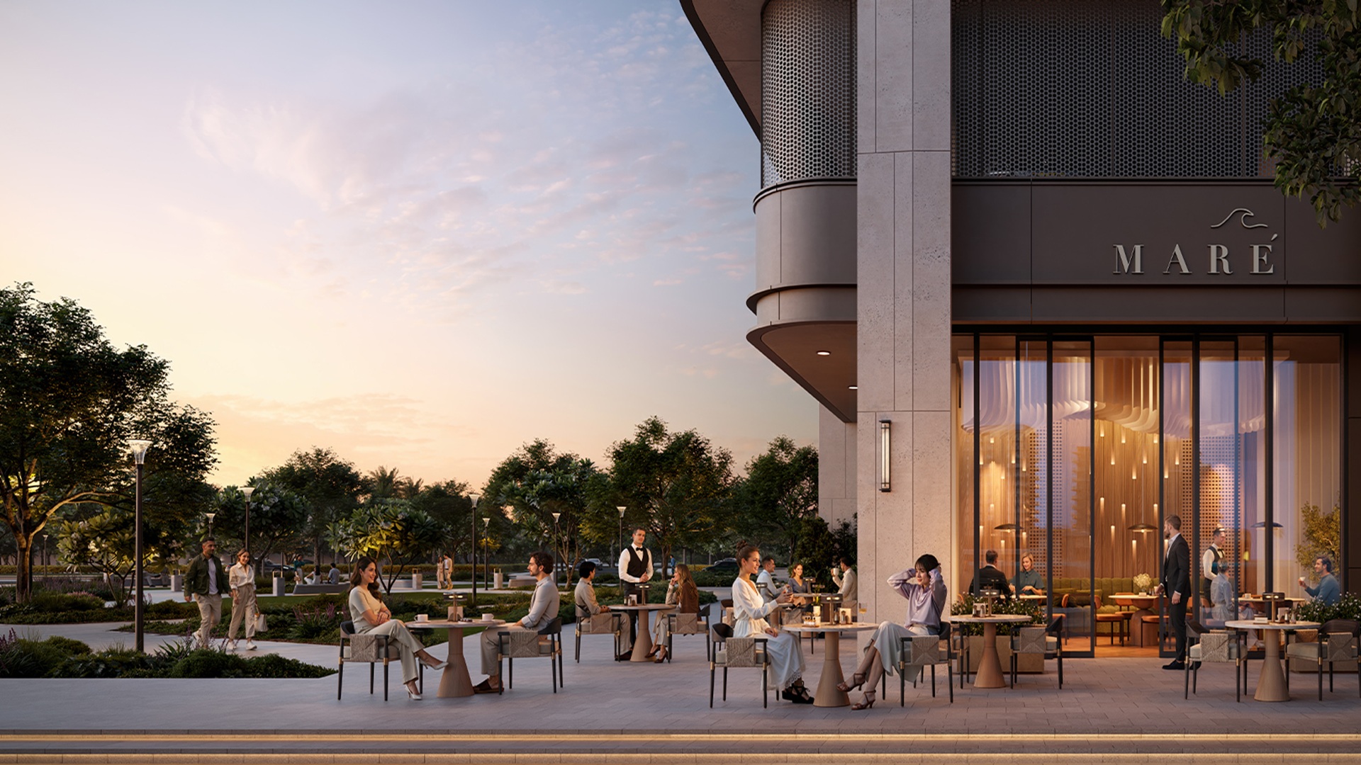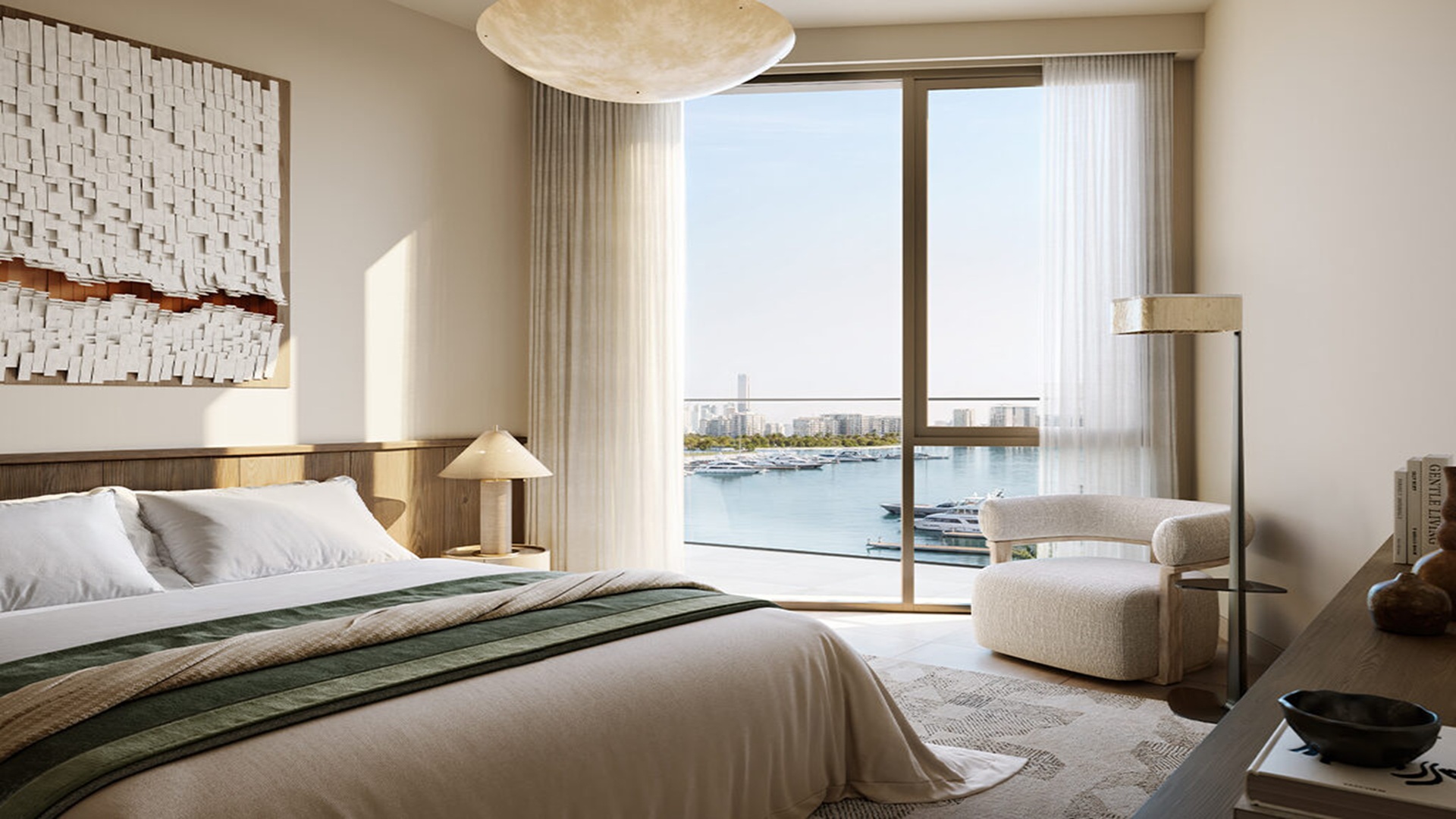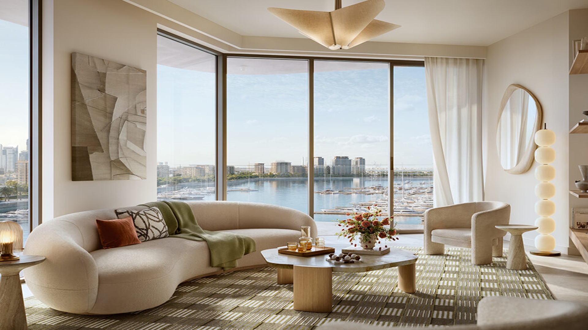 This tower reflects the future look of a modern, cosmopolitan city with its elegant structure that reaches high into the sky, offering amazing views of the lively port, the blue sky, and the sea. The outside of the building is made with high-quality materials, large glass windows, big balconies, and clean lines, with a calm, earthy color scheme that gives it a refined feel.