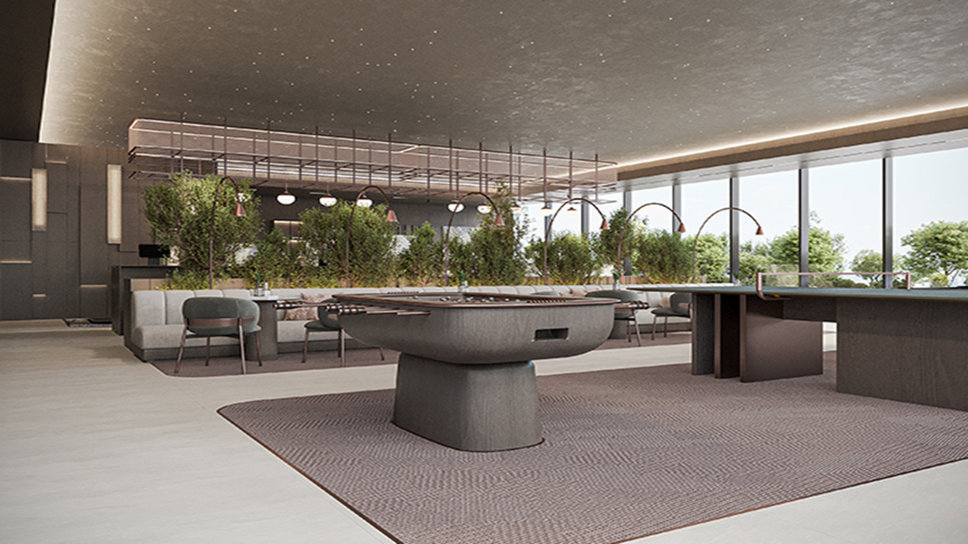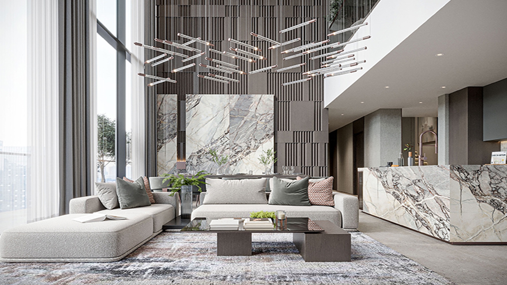 The interiors are designed with open, spacious layouts and a soothing color palette that creates a calm and elegant atmosphere. Large floor-to-ceiling windows in living areas and bedrooms provide abundant natural light and stunning views of the surrounding Motor City community, enhancing comfort and visual appeal.