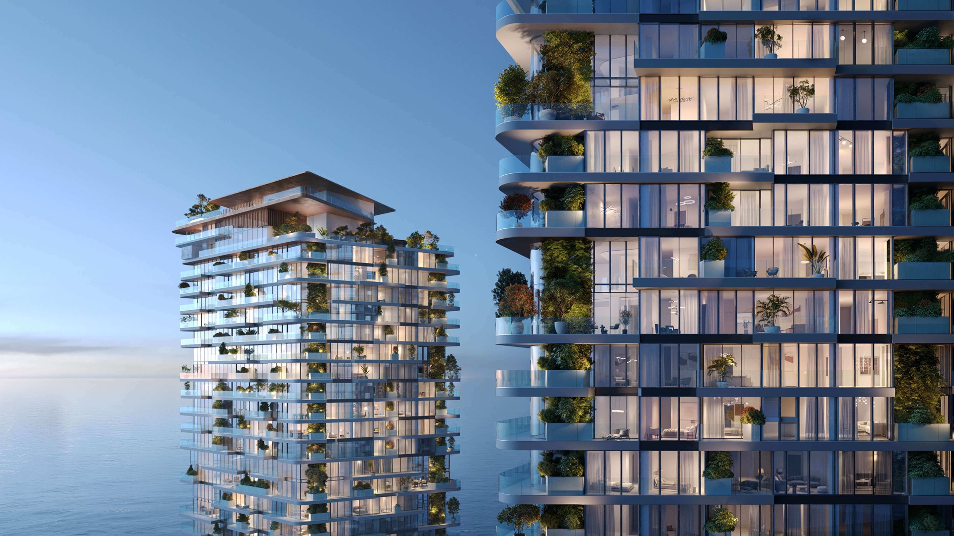 These towers stand tall, reaching up to 180 meters and 133 meters with 44 and 31 floors respectively. The unique shapes of the buildings resemble a sailing ship catching a breeze, with curves and lines that are inspired by nature and the beauty of the coast. The design includes balconies, terraces, glass walls, and a soft, bright white color, creating a harmony between indoor living spaces and the natural surroundings. The property is part of the larger Cove development, and the ground floor connects to a walking path that leads to shops. The main entrance area has a raised platform with shared facilities and views of the Cove and the sea.